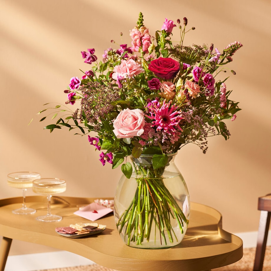 Laat de liefde spreken op Valentijnsdag met dit Valentijnsboeket. Met zorg en aandacht samengesteld met de mooiste seizoensbloemen. Een bijzonder boeket om de liefde te vieren. De combinatie van elegante bloemen in zachte roze- en paarstinten maakt dit boeket een echte blikvanger. Perfect om op 14 februari – de dag van de liefde – iemand mee te verrassen.